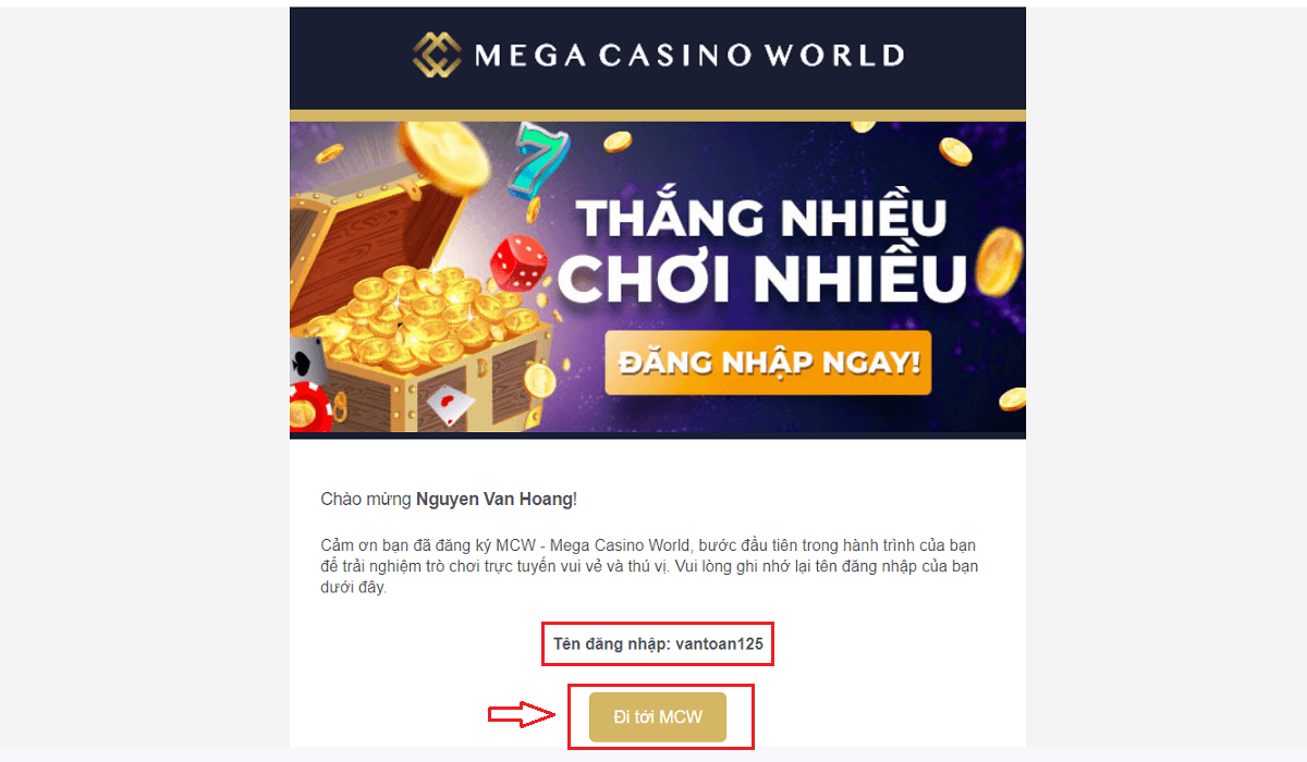 Bước 4: Nhà cái MCW casino sẽ gửi cho bạn một địa chỉ Email xác nhận đăng ký và tên đăng nhập vừa tạo. Lúc này bạn có thể đăng nhập vào nhà cái CasinoMCW và tham gia các trò chơi mình yêu thích.